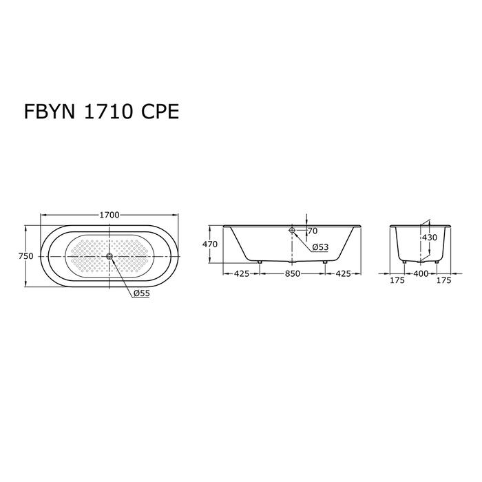 TOTO Bathtub FBYN1710CPE without Hand Grips Capacity: 187 Liters Specifications Height: 470 mm Width: 1700 mm Depth: 750 mm
