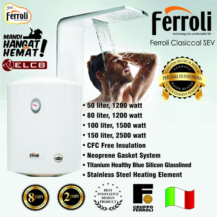 – Made in ITALIA – CFC Free Insulation – Neoprene Gasket System – Titanium Healty Blue silicon glasslined – Stainless Steel Heating Element – With ELCB – Garansi 8 Tahun Inner Tank, 2 Tahun Electrical parts Ferroli merupakan pemanas air dari itali yang berkualitas dan bergaransi, dalam komponen ferolli terdapat Anticalcare Heating Element adalah elemen panas generasi terbaru PLUS Technology yang berfungsi mengurangi terbentuknya kerak dielemen panas efisiensi pemanasan dan hemat energi Info: Pada Blue silicon titanium glassline proses menggunakan teknologi elektrostatis yang dipanaskan untuk menghasilkan tangki bagian dalam yang sangat tahan korosi Innovation flange sistem yang tidak membutuhkan alat khusus untuk perawatan Neoprene gasket sistem yang struktur pengamanan water heater lebih tahan lama tidak berbau baik kesehatan dan ramah lingkungan Komponen Classical : – CFC Free Insulation Polyurenthane Foam High Density yang ramah lingkungan, CFC free merupakan isolasi panas yang baik dapat mengurangi beban kerja elemen panas sehingga pemakaian listrik lebih irit dan efisien – Neoprene Gasket Sistem Struktur pengaman water heater lebih tahan lama dengan karakter elastis, tidak berbau bersih dan ramah lingkungan – ELCB power cable berfungsi memutuskan arus listrik terjadi kebocoran arus – Safety Valve untuk memastikan tidak terjadi kelebihan tekanan keluar yang tepat pada tangki Keunggulan Produk: – Safety thermostant untuk mengatur suhu yang dilengkapi automatic cut off di suhu yang terlalu tinggi dalam kondisi abnormal terjadi – Magnesium anode untuk mencegah korosi pada tangki – Anticalcare heating element panas generasi terbaru dengan PLUS technology untuk mengurangi kerak dielemen panas sehingga efisiensi pemanasan tinggi dan hemat energi