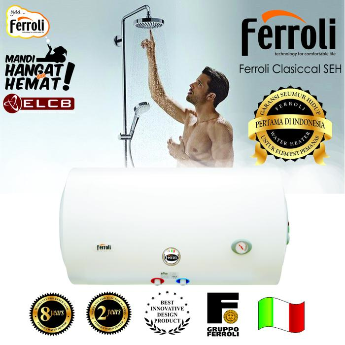 & Free ShippingClassical – SEH 50 Pemanas air Ferroli – ITALIA Kapasitas 50 liter, 1200watt Made in ITALIA CFC Free Insulation Neoprene Gasket System Titanium Healty Blue silicon glasslined Stainless Steel Heating Element With ELCB Garansi 8 Tahun Inner Tank, 2 Tahun Electrical parts Komponen Classical : – CFC Free Insulation Polyurenthane Foam High Density yang ramah lingkungan, CFC free merupakan isolasi panas yang baik dapat mengurangi beban kerja elemen panas sehingga pemakaian listrik lebih irit dan efisien – Neoprene Gasket Sistem Struktur pengaman water heater lebih tahan lama dengan karakter elastis, tidak berbau bersih dan ramah lingkungan