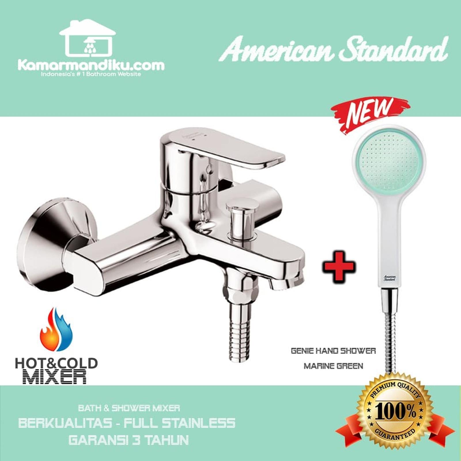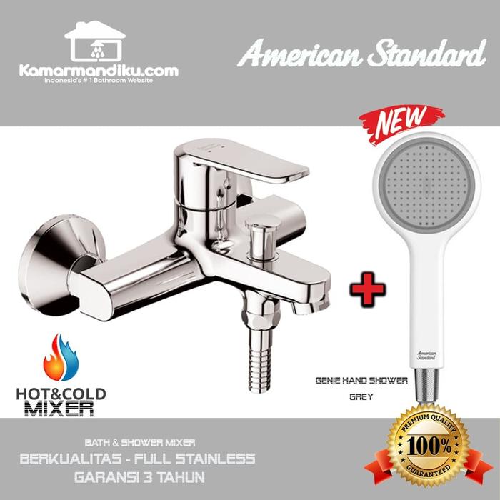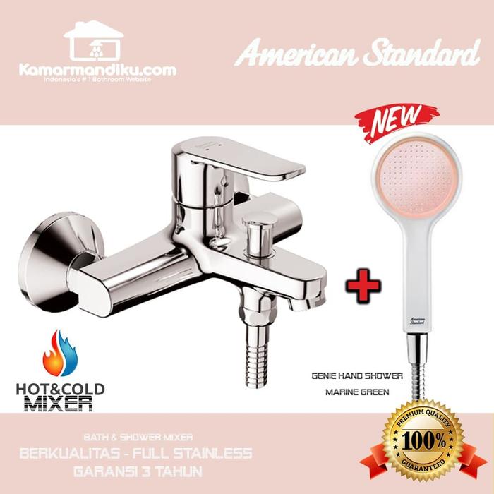 & Free ShippingKeran shower panas dingin model terbaru dari American Standard + dengan hand shower model terbaru Genie series ( semburan air lebih kencang dari shower biasa). Kelengkapan Produk : 1. Bath amp; shower mixer panas dingin. 2. Head shower Genie ( Hijau / Orange / Abu-abu) 3. Selang Hose shower 1.5 meter 4. Bracket atau gantungan shower