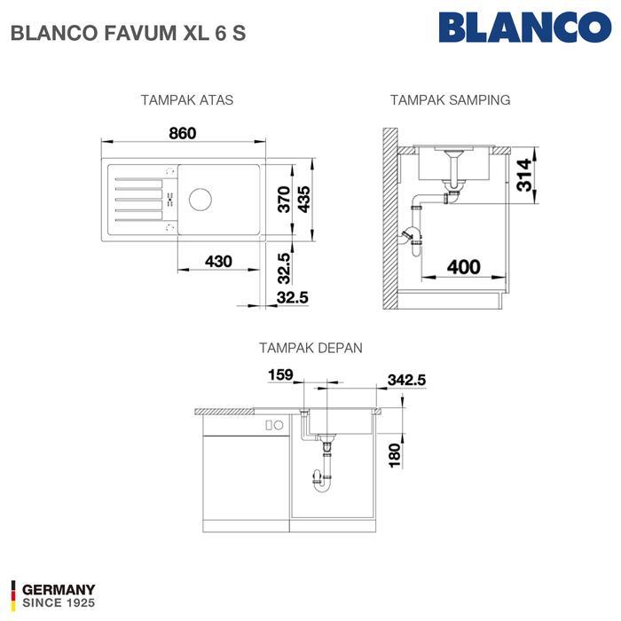 & Free ShippingBLANCO FAVUM XL 6S (Sink Only) – BLANCO Favum XL 6S dirancang dengan desain fungsional yang tak lekang oleh waktu – Spesifikasi: 1 lubang besar (XL) ukuran 43cm x 37cm + sayap – Bak cuci piring dapat dipasang secara reversible, sayap bisa dipasang disebelah kiri atau kanan tergantung desain dapur. – Tipe pemasangan: Insert, diatas top table dapur – Dilengkapi dengan sistem pembuangan 3 1/2 – Ukuran Sink : 860 x 435 x 180 mm