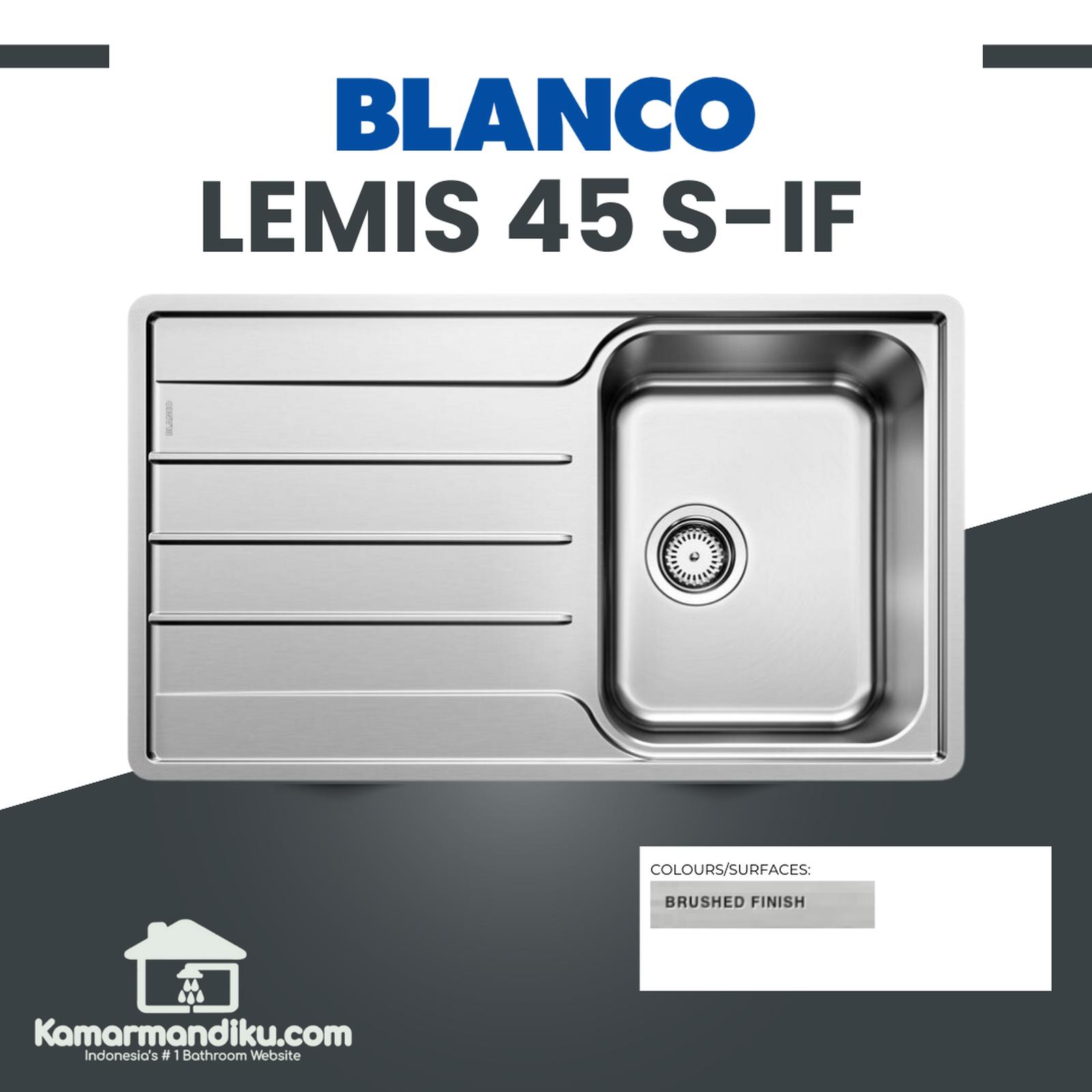 & Free ShippingBLANCO Lemis 45 S-IF – Seluruh bak cuci piring BLANCO dibuat dari bahan berkualitas tinggi: Stainless Steel 304 dengan kandungan 18/10 (18% Chromium, 10% Nikel) – BLANCO Lemis memberikan desain linear yang elegan dan modern – Kapasitas mangkuk/lubang untuk mencuci piring besar – Bisa dipasang #34;reversible #34; – sayap di sebelah kanan atau kiri. Tolong masukkan di nota pemesanan – Tipe pemasangan: IF flatrim for flushmount, sisi tepian kitchen sink rata dengan table top, memberikan unsur kemewahan – Ukuran: 860 x 500 x 205/205 mm