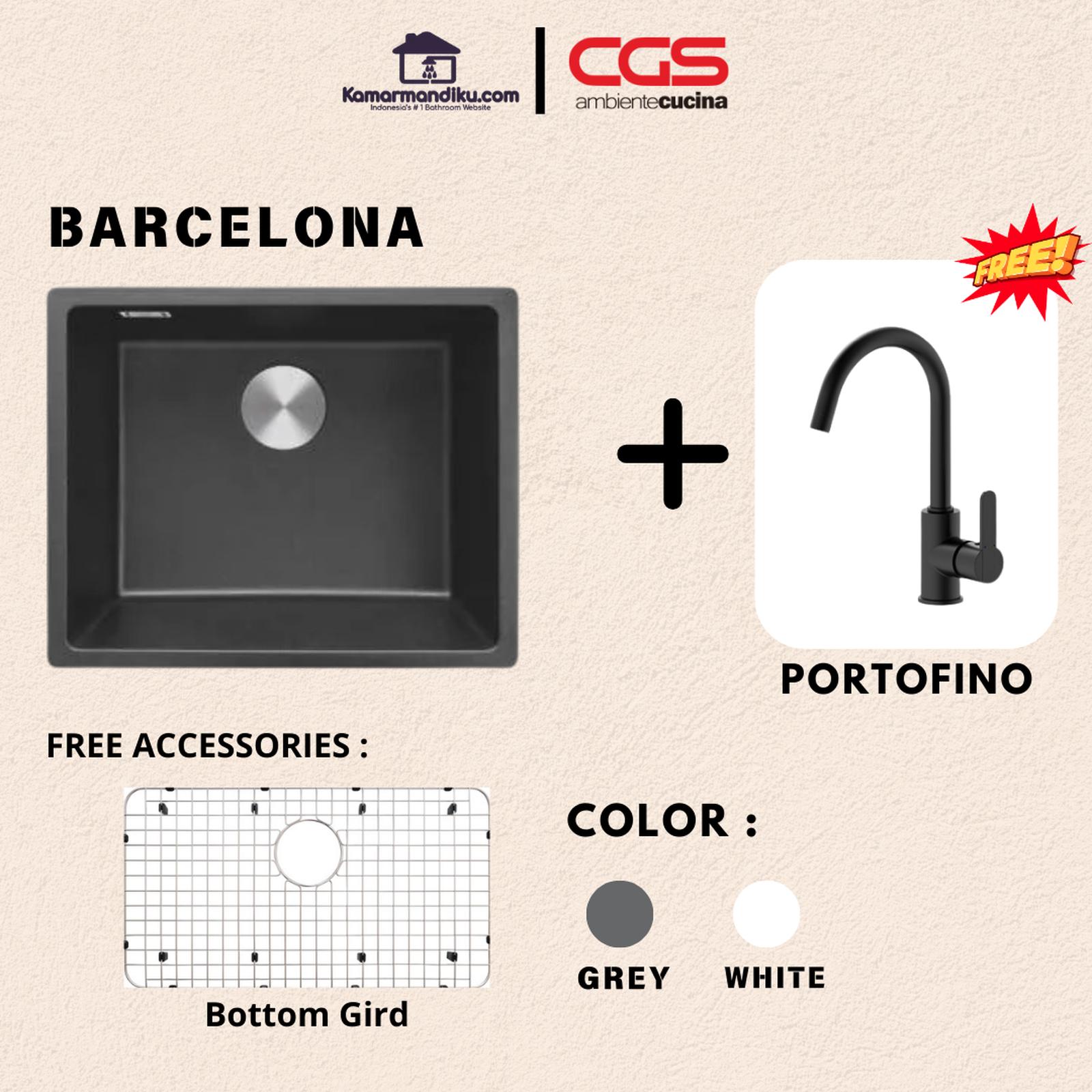 & Free ShippingCGS BARCELONA ROCK GRANITE -Material Komposit RockGranite Terbuat dari 80% granit alami -Kuat dan tahan lama, memiliki tampilan dan sensasi sentuhan seperti batu asli -Permukaan sink tidak berpori, higienis, tahan noda amp; anti-bakteri -Perawatan simpel dan mudah dibersihkan, serta tahan terhadap goresan -Dilengkapi dengan aksesoris premium Bottom Grid untuk melindungi sink dari benturan peralatan makan -Dilengkapi dengan intelligent drain waste kit for RockGranite yang berukuran 3,5 inch -Tersedia dalam warna: Black,Grey,White -Tipe Instalasi: Insert amp; Undermount -Dimensi Luar Kitchen Sink: 550x 450 x 190 mm -Dimensi Lubang: 500 x 400 x 190 mm