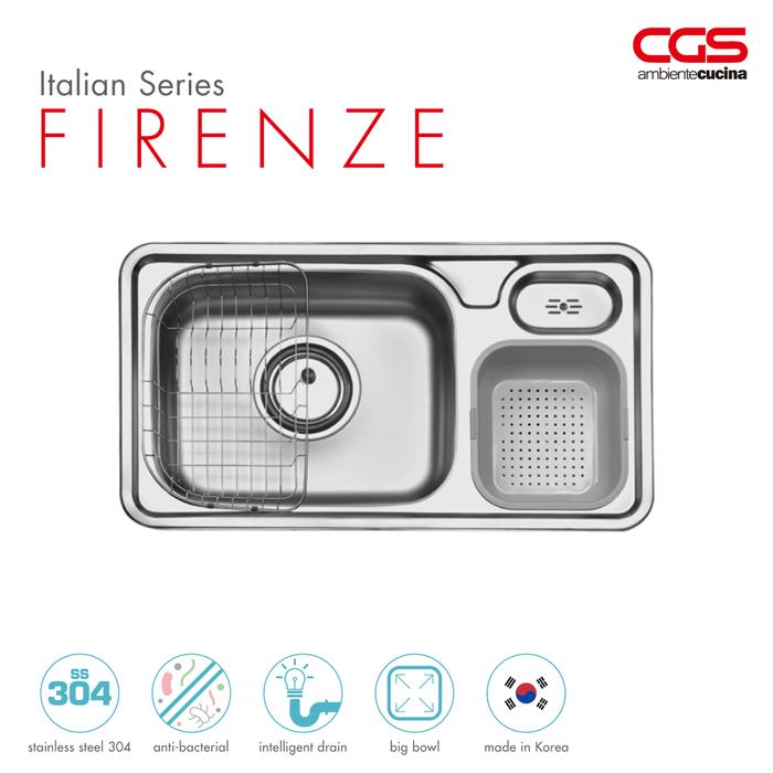 & Free ShippingCGS FIRENZE – Terbuat dari bahan stainless steel 304 berkualitas tinggi – kandungan 18% chrome dan 8% nikel Finishing stainless steel brushed – Fitur : 1 lubang cuci piring yang besar dan dalam dilengkapi lubang tambahan untuk mempersiapkan makanan. – Dilengkapi satu lubang kecil untuk soap dispenser lengkap dengan drain system