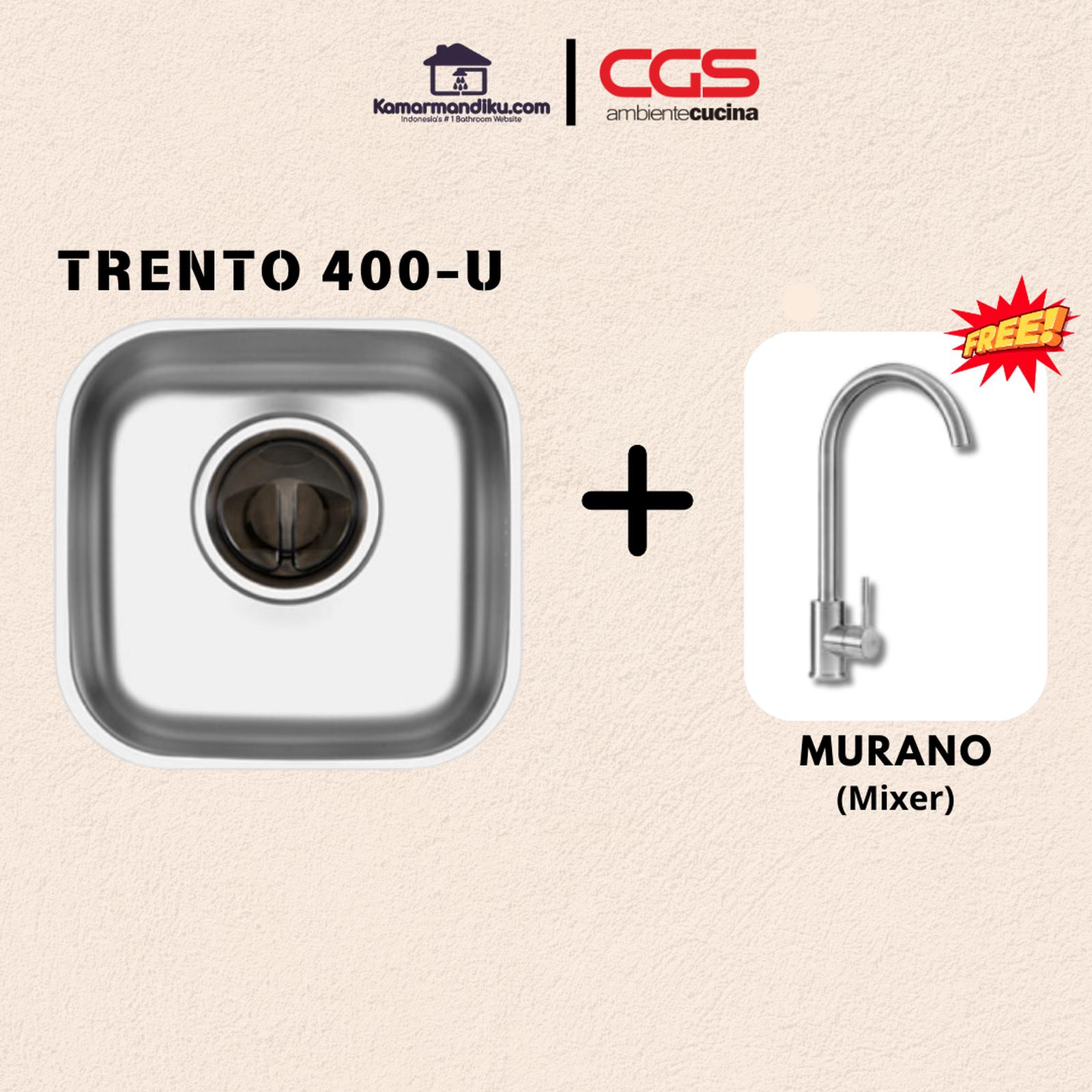 (1) CGS TRENTO 400-U – Terbuat dari bahan stainless steel 304 berkualitas tinggi – kandungan 18% chrome dan 8% nikel – Finishing stainless steel brushed – Tipe Pemasangan Sink : Undermount (dibawah top table) – Fitur : 1 lubang besar – Cocok untuk pengunaan pada dapur modern minimalis – Made in Korea Ukuran packaging : 650 x 650 x 300 mm Ukuran sink: 428 x 418 x 170 mm Ukuran lubang sink : 400 x 392 mm Kedalaman lubang : 17 cm Ketebalan stainless steel : 0.8mm Dilengkapi dengan Intelligent Drain System, berukuran 6.3 #34; inch (2) CGS Murano – Bahan dasar dari stainless steel 304 – Kran Air dengan model minimalis, cocok untuk design dapur modern – Mendukung kran air dingin dan air panas ( mixer tap ). – Kran Air dengan model minimalis, cocok untuk design dapur modern.