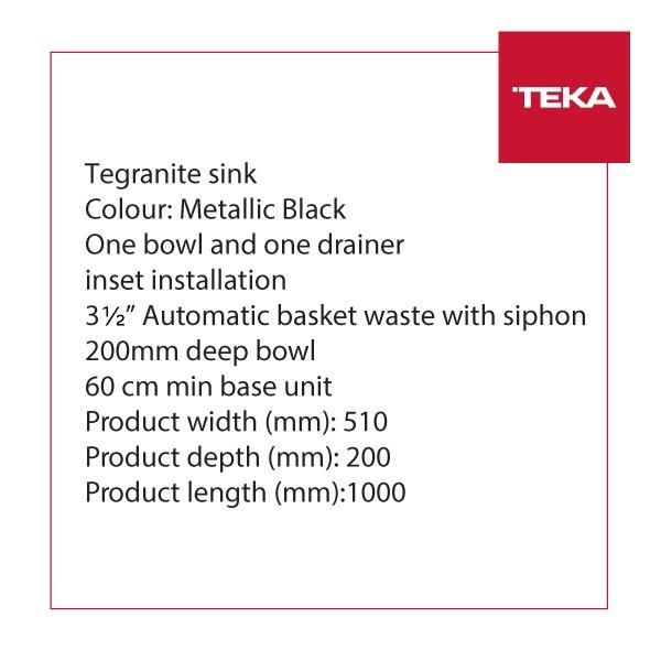 FREE ONGKIR JABODETABEK Tegranite+ The hero of the kitchen Wastafel Teka Tegranit+ telah berkembang menjadi area kerja bagi pecinta dapur yang mencari inovasi, kepraktisan, dan fungsionalitas di dapur. Stone, Forsquare, dan Square adalah rentang baru untuk produk Tegranit+ baru kami. Mereka dibuat dengan Quartz berkualitas tinggi, bahan yang sedang naik daun. 80% Quartz dikombinasikan dengan resin akrilik untuk mendapatkan bahan yang solid, tahan terhadap guncangan termal, benturan dan kotoran. Selain itu, tersedia dalam berbagai warna. Kualitas dan warna… Anda bisa memilih! Tegranite + sink 1 bowl and 1 drainer High resistance surface to impacts, thermal shocks and high temperatures Excellent UV resistance against decoloring Bacteria-free surface very easy to clean One bowl and one drainer Inset installation 3½ #34; automatic basket waste with siphon 200 mm deep bowl 60 cm base unit Warna hitam metalik General measures Product width (mm): 510 Product depth (mm): 200 Product length (mm): 1000 Net weight (Kg): 13,5 Main Bowl Main Bowl Length (mm): 480 Main Bowl Width (mm): 414 Main Bowl Depth (mm): 200