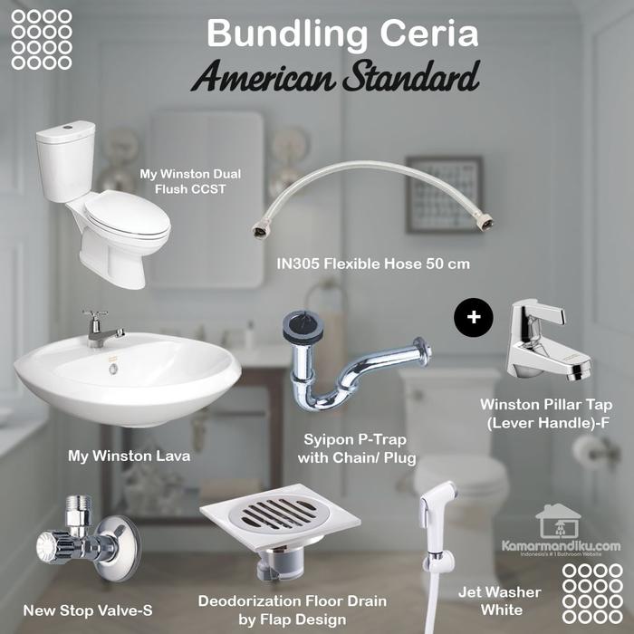Bundling Ceria American Standard Closet Wastafel Complete My Winston Yang terdapat di dalam paket : 1. American Standard Kloset My winston CCST 2. American Standard Wastafel My Winston 3.. American Standard Keran Pillar tap My winston LEVER 4. American Standard Stop Valve 5. American Standard Flexible Hose 50cm 6. American Standard P-Trap w/ Chain Plug (Afur pembuangan) 7. American Standard TP 404 Jet washer White 8. American Standard Floor Drain deodorization 10 x 10cm Mohon Chat terlebih dahulu untuk ketersediaan Stok . Terimakasih .