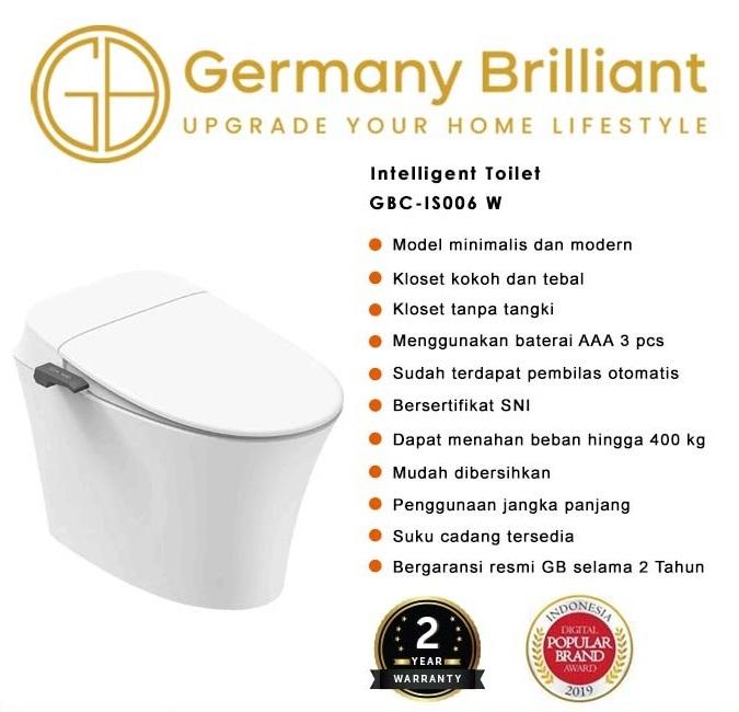 & Free ShippingCLOSET duduk Germany Brilliant GBCIS006-W KODE: GBCIS006-W – Germany Brilliant menghadirkan closet bersertifikat SNI. – Model minimalis dan modern – Kloset kokoh dan tebal – Kloset tanpa tangki – Menggunakan baterai AAA 3pcs – Sudah terdapat pembilas otomatis – Dapat menahan beban hingga 400kg – Mudah dibersihkan – Penggunaan jangka panjang – Suku cadang tersedia – Bergaransi resmi GB selama 10 Tahun – Jarak AS = 30cm