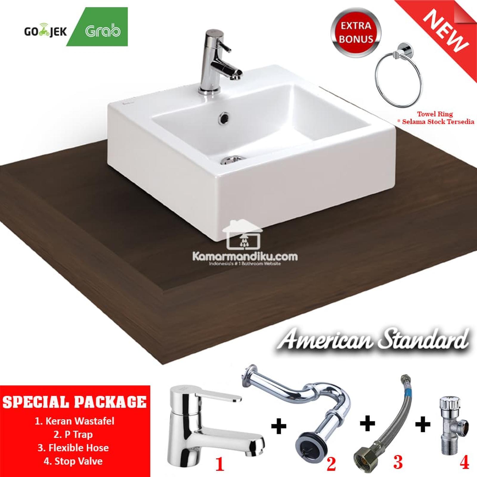Wastafel Meja terbaru dari American Standard. MIZU 45. Siap pasang, tidak perlu ada kelengkapan lain yg harus dibeli. Bonus kelengkapan wastafel ( semua merk American Standard, dengan garansi 3 thn ) sbb : 1. Keran Wastafel American Standard dingin only (pilihannya ada single lever dan cross sesuai gambar dislide ya) 2. P Trap 3. Flexible Hose 4. Stop Valve *** EXTRA bonus : Towel Ring American Standard ( berlaku selama stocak masih ada ) ** Towel ring habis ya kak Bisa kirim Via gojek/ Grab. mohon info sebelum order ya , karena kami harus rubah setting beratnya terlebih dahulu. Untuk Luar kota wajib packing kayu ya .. + tambahan biaya 100.000 WASTAFEL DIMENSI : width: 450mm length: 450mm height: 177mm
