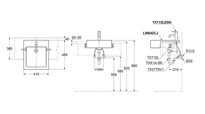 TOTO Wastafel LW642CJ Specifications Height: 127 mm Width: 415 mm Depth: 485 mm