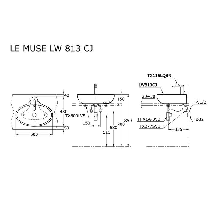 TOTO Wastafel LW813CJ Specifications Height: 150 mm Width: 600 mm Depth: 480 mm
