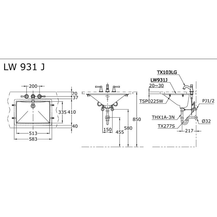 TOTO Wastafel LW931J Specifications Width: 513 mm Depth: 335 mm