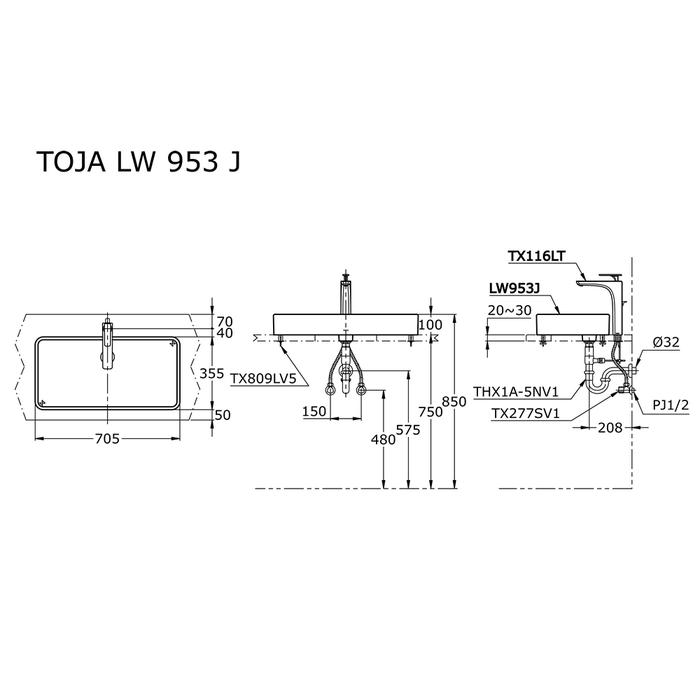 TOTO Wastafel LW954J Specifications Height: 109 mm Width: 350 mm Depth: 700 mm