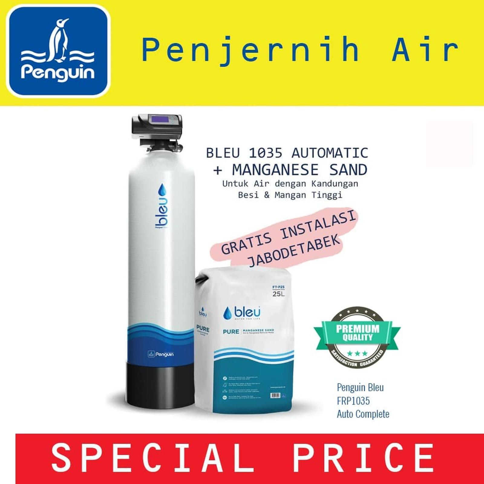Gratis jasa pemasangan unit.. Hati-hati dengan barang tiruan, harga murah belum tentu medianya berkualitas. Tanyakan kami untuk detail informasi. Produk terbaru dari Penguin, Filter air Bleu dengan ukuran tabung 1035 dan media Manganese berkualitas. Filter ini berfungsi untuk mengurangi Kandungan besi, Mangan dan H2S dari dalam air. Memiliki kepala AUTOMATIC VALVE sehingga anda tidak perlu repot Bilas / Backwash, sangat mempermudah dalam perawatan, cukup set waktu pada valve untuk melakukan backwash, amp; fast rinse sehingga media dapat menyaring kontaminan dengan lebih maksimal. Spesifikasi : Bahan Tabung : FRP ( Fiber Reinforced Plastic) Diameter Tabung : 10 inch (25,4 cm) Tinggi Tabung : 35 Inch (889cm) Tekanan Maksimal : 10 Bar ~150psi Suhu Maksimal Operasional : 49 C Drat Inlet : 3/4 #34; Drat Outlet : 3/4 #34; Yang termasuk dalam paket : – Tabung Filter – Filter Valve – Strainer Atas, Bawah amp; Pipa Distributor – Media Filter – 2pcs Keni Drat dalam 3/4 #34; – 1 Batang (4 Meter) Pipa AW 3/4 #34; – 6pcs Elbow / Keni Rucika – 2 pcs Sok Pipa 3/4 #34; Syarat amp; Ketentuan Gratis Ongkir : – Order via tokopedia tetap dikenakan biaya ongkos kirim seberat 1kg. biaya ini akan digunakan untuk mengirimkan Invoice yang dikirimkan dari Jakarta. – Silahkan hubungi kami untuk mengatur jadwal pemasangan. – Paket ini sudah termasuk pemasangan amp; material. – Material yang termasuk dalam paket ini sudah disebutkan diatas, jika pada saat pemasangan diperlukan material tambahan maka akan ditagihkan saat instalasi – Pemasangan di dak / lokasi diatas lantai 3 akan dikenakan biaya tambahan. Disclaimer : – Untuk mendapatkan hasil terbaik, dianjurkan untuk uji lab terlebih dahulu – Hasil penyaringan / umur media sangat relatif tergantung jumlah pemakaian air, kualitas air baku amp; perawatan. – Garansi 1 tahun diberikan hanya untuk tabung amp; instalasi. HARGA belum termasuk jasa pasang ( pasang unit dan aksesoris stop kran, knee biaya Rp. 750.000 area Jadetabek).